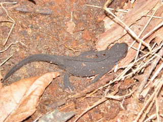 【左】スズダケが生えた表日本側のブナ林 【右】倒木を起こしたらイモリが冬眠していました。