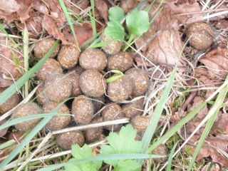 【左】丸いからノウサギの糞?。鹿が来たらスズダケが食べられる。 【右】ブナ林に住むアカアシクワガタが遊歩道の手すりに