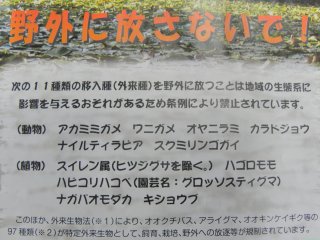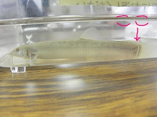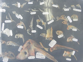 【左】カラドジョウ(外来)オビレの手前のところに幕がある。 【中】愛知県環境部で作られた移入種(外来種)取り扱い注意のチラシ 【右】骨の標本