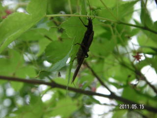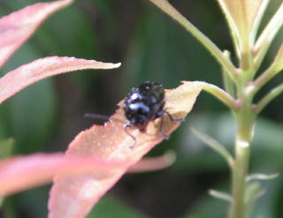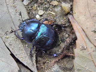 はじめに目を引いた昆虫がオオセンチコガネ(ルリ型)。メタリックブルーのとても美しい甲虫です。はじめて見る美しさに感動しましたが、この甲虫は春日山では何度も出会い普通にいるようです。