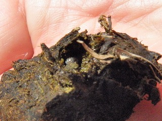 【左】新鮮な鹿の糞の中にコガネムシが 【中】イヌガシの花殻 【右】清流に住むプラナリアの仲間