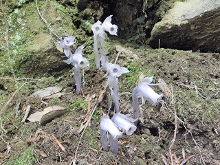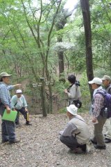 沢伝いの道ではイチイガシなどの巨木の観察。また、道しるべの様に所々でギンリョウソウを見たり、オナガミズアオ?、キノコ、タゴガエルの声なども観察しました。残念ながらヤマビルはいませんでした(塩水までかけて万全だったのに・・・)若草山頂上のは、久保田さんに奈良の風景を見ながら歴史や文化など多義にわたりお話をしていただきました。