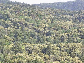 【左】若草山から眺める春日山原始林の樹冠 【右】黄色い花は若草山のジャケツイバラ