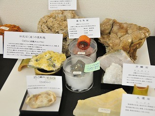 【左】 鉱物、木の実の標本など 【右】壁面に写真がたくさん飾られています。