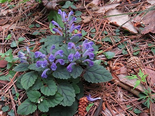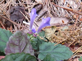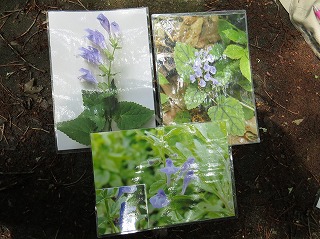【左】シソバタツナミソウの葉裏を観察      【中】上左ラショウモンカズラ。上右シソバタツナミソウ。下ナミキソウ      【右】シュンラン
