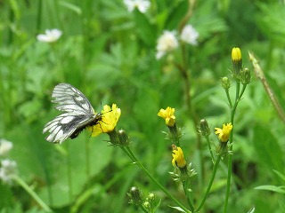 【左】コウゾリナに来たウスバアゲハ(ウスバシロチョウ)        【中】池とヒルムシロ         【右】トキソウ