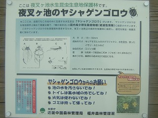 夜叉ヶ池でまず感激したのが、その景観の美しさ。そして多数のモリアオガエルと枝から下がった卵塊、彼らの声。ここでなければ味わえない感動です。池の中には、生まれ出るオタマジャクシを狙ってかアカハライモリもたくさんいた。夜叉ヶ池の固有種ヤシャゲンゴロウも見ることができました。途中、ほんの少し雨に降られましたが、本当に行ってよかったと思いました。