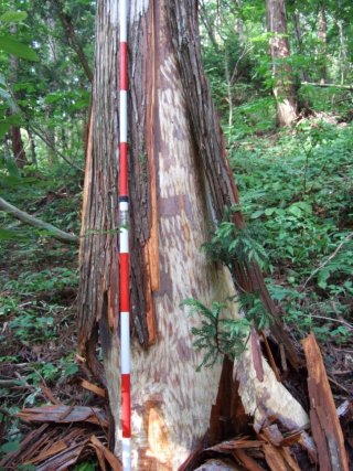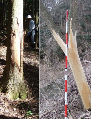【左】シカ、イノシシ、クマの樹皮の剥ぎ方の違い解説       【中】測量ポールを使い測定       【右】ムササビの食べ痕