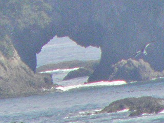 【左】望遠で撮影した島勝の海食洞門 【中】船越の海跡湖 【右】海跡湖の周りはハマナツメが群生している