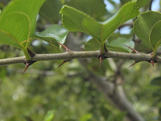【左】ハマナツメの果実 【中】ハマナツメの枝に鋭いとげ 【右】海跡湖の生育していたオニビシ