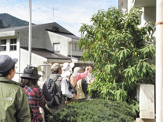 2日目は、馬越峠を植物を確認しながら楽しみました。ルートは道の駅海山〜天狗倉山山頂の往復、各々の体力で行ける所まで行きました。道中、ミカエリソウやリンドウの花、ルリミノキの実、紫色のさやのノササゲ、白いイズセンリョウの実など様々な植物が楽しませてくれました。次に尾鷲の向かい、県の天然記念物、法念寺の鉄魚を見に行きました。鉄魚は金魚(和金)とギンブナの交配によりできた品種で、尾びれの長いフナの様な魚でした。最後は、国指定天然記念物、九木神社樹叢をチェック。ここにはヘゴ科のシダ、クサマルハチがあるとのことでかなり探し回りました、が、発見できず残念でした。