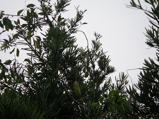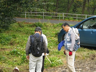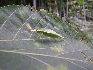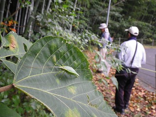 【左】駐車場は草刈り中 【右】アオマツムシ
