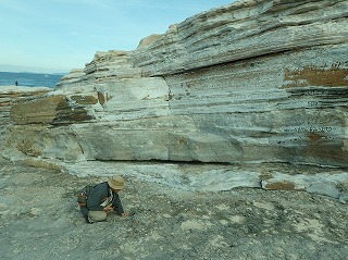 「千畳敷」と「三段壁」に向かう。「千畳敷」は、第3紀層の砂岩からなる岩盤からできており、巨大な平らな岩が不思議な景観を造っている。その南側にはそそり立つ断崖「三段壁」がある。 ここでは、イソヒヨドリ、生きたタカラガイ、タイドプールのハゼなどの小魚を観察。