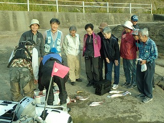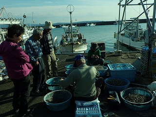 次に向かったのは南部堺港。海の中に泳ぐハコフグ発見。港では、網の手入れをする方、はえ縄漁の準備をしている方などにお話を伺う。