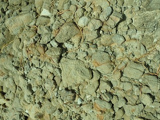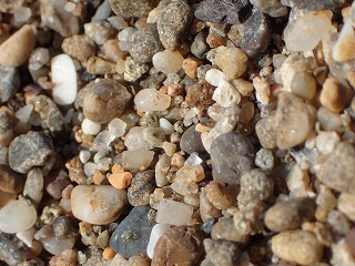 【左】千里浜の砂岩が入った礫岩 【中】千里浜の砂(拡大写真) 【右】千里浜に流れ着いた貝殻
