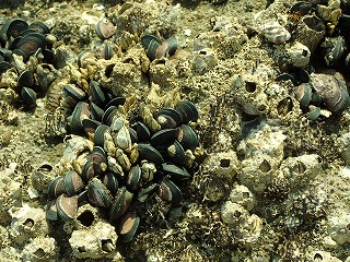 【左】マツバガイとカメノテ 【中】イガイ、クロフジツボ、イワフジツボ、など 【右】水族館の水槽