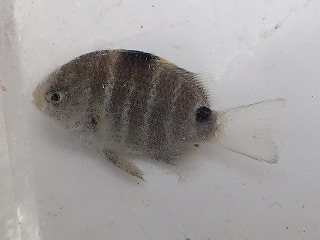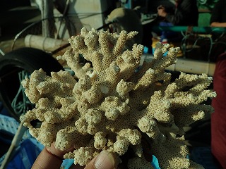 【左】田辺港で頂いたサンゴ(エンタクミドリイシ?) 【中】シマスズメダイ 【右】ギンユゴイ?