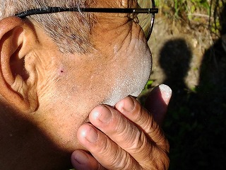 【左】岩石を肌に試し塗り 【中】メナモミ 【右】宿での懇談