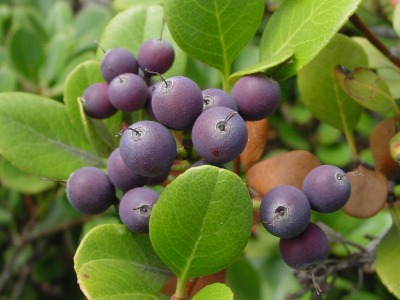 【左】知多地方の海岸にも自生しているシャリンバイです。黒い実が付いています。