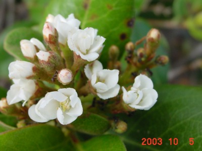【右】シャリンバイの花です。名前は車輪梅からです。葉が車輪状に付き、花が梅の花みたいからです。