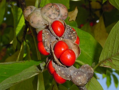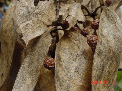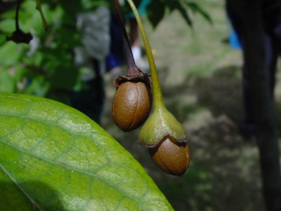 【左】アオギリの種子です。アオギリはココアいわゆるチョコレートの原料になるカカオと親戚の植物です。