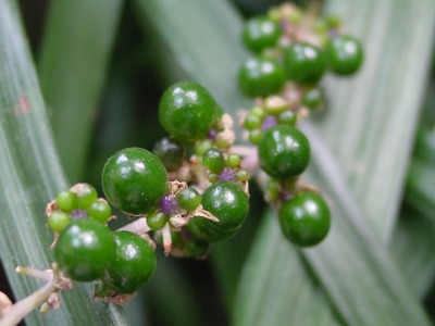 【左】森の入り口にヤブランがありました。これから黒い実に成ります。夏も観察しましょう紫色の美しい花が咲きます。