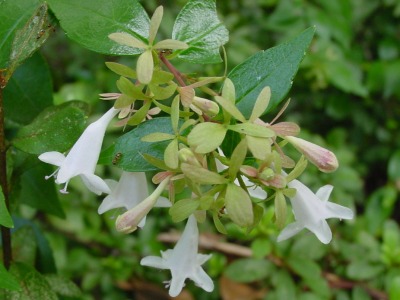 【左】ツクバネウツギの仲間をアベリヤといいます。この花は園芸用に改良されたものです。日本にはツクバネウツギとコツクバネウツグギが自生しています。少なくなった日本産を育てたいですね。