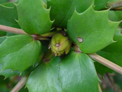 【左】春に花を咲かせる準備をしているヒイラギナンテンです。外国から来た園芸植物です。
