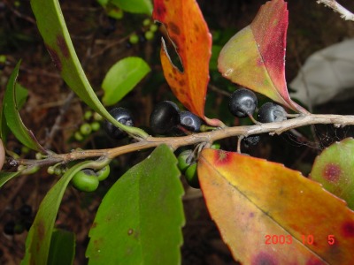 【右】ヒサカキです。知多半島の松が枯れた後にたくさん生えてきました。小鳥が好んで果実を食べて植樹をしてくれました。