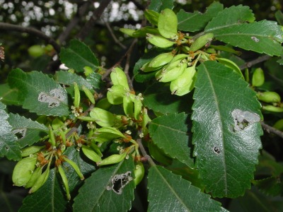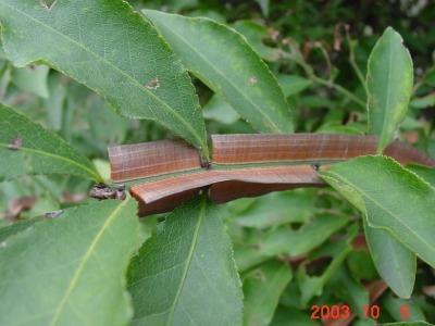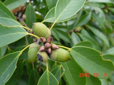 【右】クヌギです。クヌギは関東の樹木です。この地方のものは、葉の裏に白い毛があるアベマキです。比べてみてください。