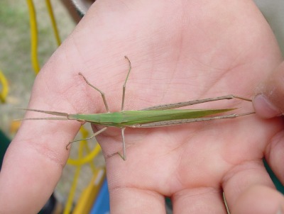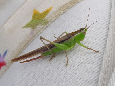 【右】イネ科の植物を食べているホシササキリです。みどりの少年団のユニホームに止まりました。