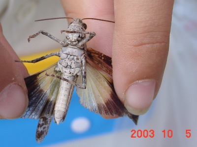 【左】羽を広げて検分させていただきました。クルマババッタモドキでした。