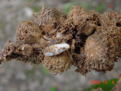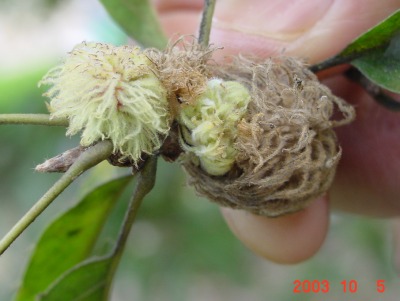【左】クヌギに虫コブがありました。クヌギエダイガフシです。タマバチの仲間が作ったものです。