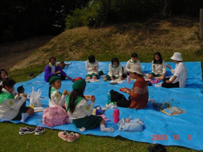 【右】楽しいお昼です。弁当を作るのに皆さんお手伝いできましたか。まさか買ってきたのでは。