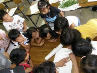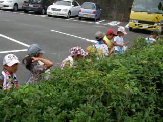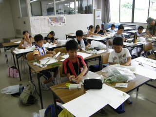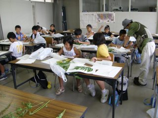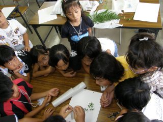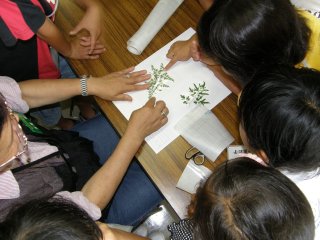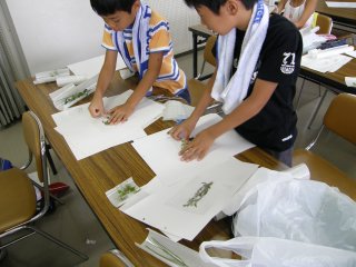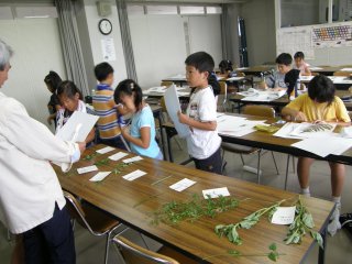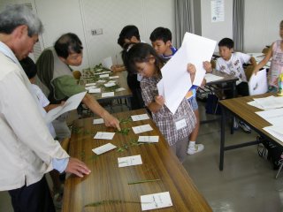 植物標本を作る意義について簡単にお話した後、植物の採集をしました。採集した場所は、役場の周りと阿久比中の周りで行いました。採集した植物はごくありふれた身近な植物でした。公民館にもどり標本作りを開始しました。台紙に標本を置き、図書館などで使用しているブックカバ−で貼り付ける方法で行ないました。順調に作成作業が進みましたので予定時間より30分早く終了することが出来ました。余裕時間を利用して、最後にネイチャーゲームの「コウモリとガ」と言うゲームを楽しく行うことができました。(記・降幡)