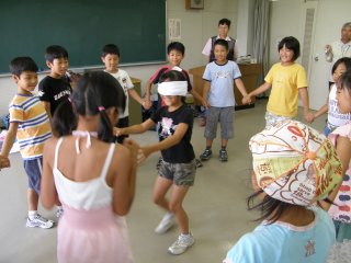 【左】最後にネイチャーゲームの「コウモリとガ」言うゲームを楽しく行いました。
