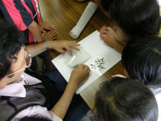 【右】標本作成C 丁寧に表を挟み貼り付けます。
