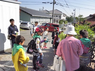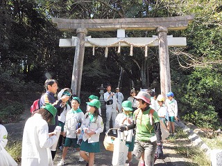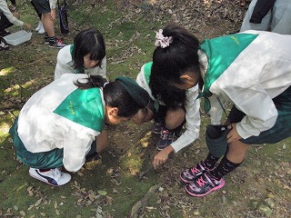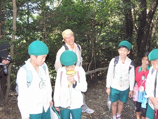 ほとんどグル−プが椋岡の集落の中を観察しながら箭比神社に向かいました。箭比神社では、スダジイの純林を観察し、その木の根元に生えていたオオワライタケの束生を見つけ感激していました。また、ニホンミツバチが営巣しているのを見つけたグル−プもありました(記・降幡)