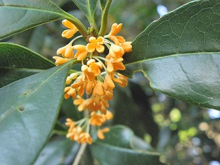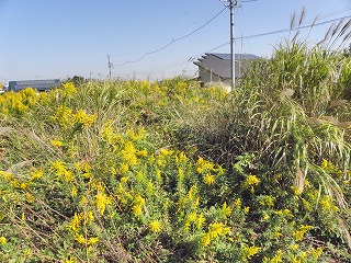 【左】セイタカアワダチソウの中にヨシが進入 【中】キンモクセイ 【右】箭比神社の御神木、アベマキ