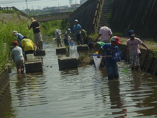 殿越川は阿久比高校から下流は3面張りとなっている。阿久比町保健センター前に人工で小規模のワンドが作られている。ワンドの底質は砂、泥、小石で周りにわずかに植物が生えている。川の生き物の採集はワンドの中で行っている。毎年、阿久比町立中央公民館からの依頼で子供向けの川の生き物観察会を行っているが現場は安全でいろいろな生き物を観察することができる。観察した生き物により、川の環境を知ることができ有効な行事である。(降幡)