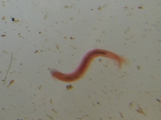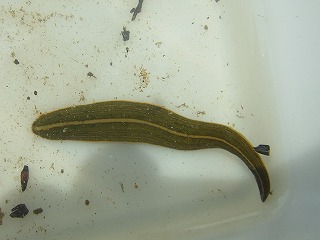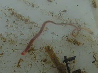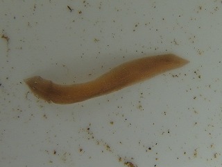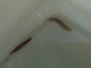 【左】アメリカツノウズムシ(外来) 【中】右上、アメリカツノウズムシ(外来)。左下、ヒルの仲間。 【右】エラミミズ