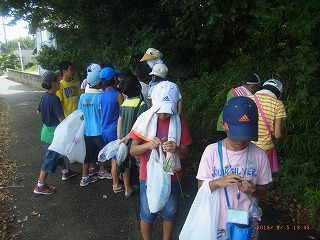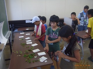 大変暑い日にも関わらず、川に入ると気持ちがよく、昨年より生きものが多いせいか、皆夢中になって生きもの探しである。あっという間に1時間が過ぎた。川沿いの石段に腰掛けて、降幡さんの解説を熱心に聞き、公民館に戻ってから発見した生きものをメモした。昼食の最中に、午後の観察が危ぶまれるくらい大雨が降り、子供達は体育館で自由遊びをした。