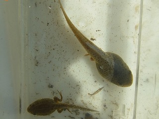 オタマジャクシ(ダルマガエル・ウシガエル・トノサマガエル)ザリガニ、アメリカツノウズムシ(外来)、ヒル、アオミドロ、エラミミズ