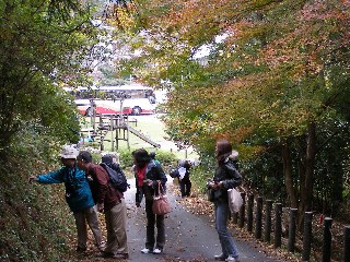 最初の予定地の滝原森林公園に予定より早く到着し、自然観察とネイチャーゲームの「フィールドビンゴ」を行ないました。ここではマツボックリのリスの食べ跡(エビフライ)、リンドウ、いろいろなのキノコを見つけ楽しい観察が出来ました。