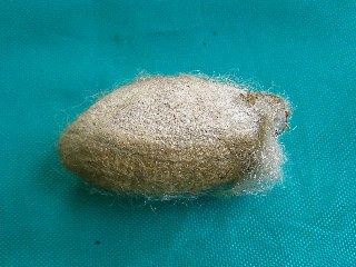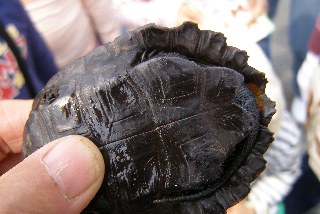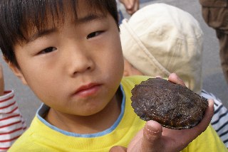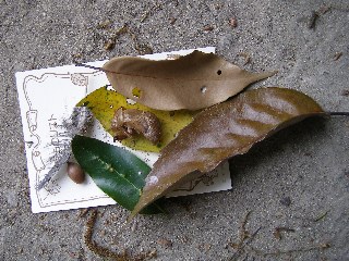 【左】オビカレハの幼虫。 【右】宝ものゲームの分かち合いです。