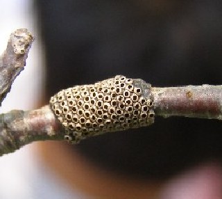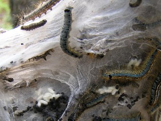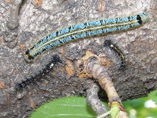 【左】オビカレハの幼虫は小さい時は集団生活します。白い小さなマユはオビカレハの幼虫に寄生したコマユバチのマユです。