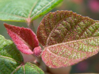 【右】星状毛という星型の毛がたくさん生えたアカメガシワの若葉。