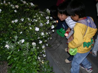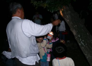 【左】ホタルのお話を聞いています。 【右】この木は何だ!!ナンジャモンジャです。