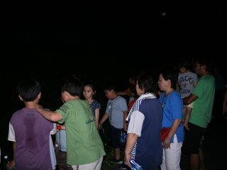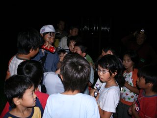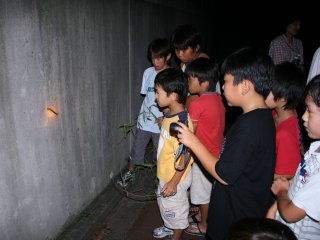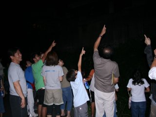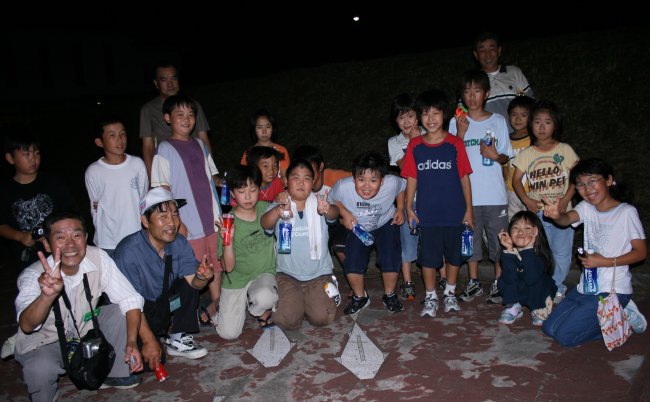 大勢の子供さん並びにお父さん,お母さん方が定刻、寺本台地区集会所前に集合、先ず「ホタルを見た人---」の問い掛けに約8割近くの方々のVサイン表示で安堵、引き続きヘイケボタルの概要説明をした後、薄曇りの中、出発しました。周囲には大規模な水田が広がり薄明かりながらも稲苗がすくすく育っているのどかな情景を北に見て水路に差し掛かるとヘイケボタル独特の淡緑光色の点滅を発見、直ぐに大きな歓声が上がりました。その後も間欠的ではありますが幸運にも幻想的なホタル観賞が出来、再び安堵しました。集会所に戻り皆の感想は「今日、ホタルが見られてよかったです」、「ホタルの光はもっと強いと思っていた」、「お伽の国に行ったようでした」などでした。その後、希望者による第ニ公園(集会所南側の雑木林)で夜の生き物観察を行い、オケラ、ヤブキリの鳴声を聴きながらクロコガネ、ノコギリカミキリ、イセノナミンマイマイ、そして圧巻は桜の葉で羽化最中のアブラゼミが観察できたことです。可愛そうにカメラフラッシュを沢山浴びての羽根伸ばしに躊躇している風情でした{ごめんなさいね}。皆で記念写真撮影後、解散しました(小川/ 記)。