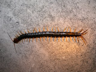 【右】トビズムカデ、大ムカデの仲間で強い毒があります。要注意、しかし、益虫ですからむやみに殺さないでください。